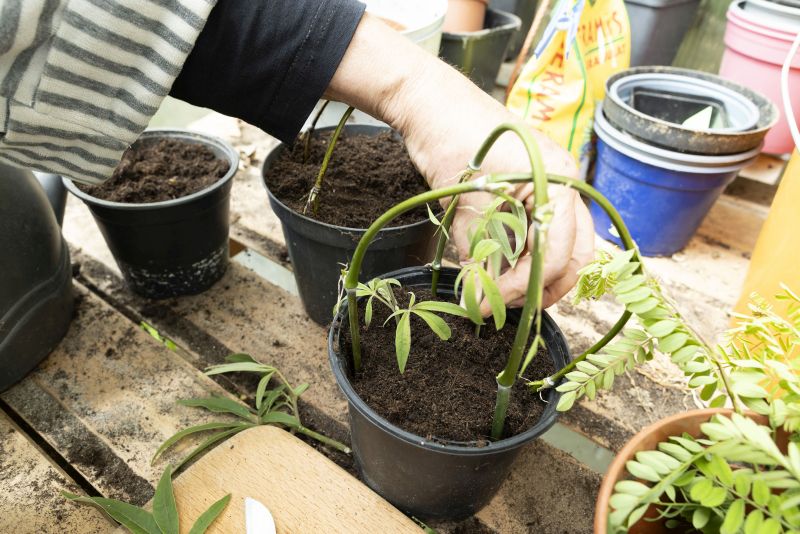 Der so vorbereitete Steckling wird in einen Blumentopf mit Anzuchterde oder eher magerer Gartenerde gesteckt und gut angegossen. Am besten steckt man drei bis vier Triebe zusammen in einen Topf, so hat man immer eine gewisse Ausbeute, auch wenn der eine oder andere Steckling mal schwächeln sollte. Ganz wichtig jetzt: Man bastelt für die Triebe ein Minigewächshaus. Einfach eine Gefriertüte über den Blumentopf stülpen – fertig. Ein paar Zweige, in den Topf gesteckt, sorgen dafür, dass die Folie nirgends aufliegt. Jetzt schneidet man an der Tüte noch die oberen Ecken ab, damit die Luft etwas zirkulieren kann. An einem warmen, aber schattigen Platz bleiben die Stecklinge nun für einige Wochen stehen. Alle paar Tage muss kontrolliert werden, ob die Feuchtigkeit noch passt. Bei Bedarf etwas nachgießen. Nach einigen Wochen sollten die Stecklinge neue Triebe und Blätter bilden – ein Zeichen dafür, dass die Operation gelungen ist.